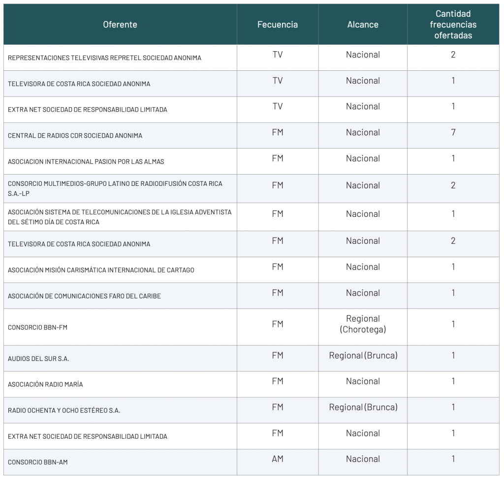 En total, participaron 25 empresas, entre las que se destacan Repretel (2 frecuencias de TV), Televisora de Costa Rica (1 frecuencia de TV y 2 de radio) y Grupo Extra (1 frecuencia de TV).