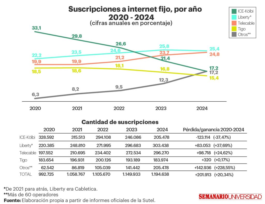 Según la publicación, en 2020, Kolbi era el proveedor de internet fijo con más suscriptores en el país, con un 33.1% del mercado equivalente a unos 328mil clientes, el segundo puesto lo tenía Liberty (Cabletica para ese momento) con un 22.2% y Telecable en el tercer puesto con un 19.9% de los clientes.